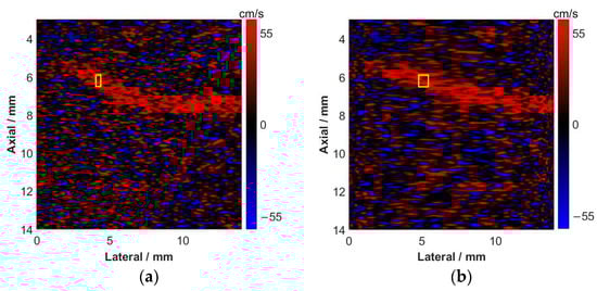 Flow image information calculated with color flow Doppler: (a) original image without motion compensation and (b) the compensated image. The yellow rectangular area was used to measure the average blood velocity.