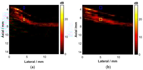 Flow image information calculated with power Doppler: (a) original image without motion compensation and (b) the compensated image. The blood flow area (yellow rectangular area) and the clutter area (blue rectangular area) were used to calculate the CNR.