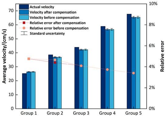 The tests were repeated five times. The average flow rate and relative error results obtained by the system at different flow rates are shown in Figure 17. According to the results, after the motion compensation, the error of the system to detect the average velocity of blood flow is less than 5%. There will be a slight improvement after motion compensation compared to before motion compensation; this is because the speed measurement we chose is in the middle region of the scanned image, where the speed of the mechanical scan is linear (as shown in Figure 7) and the error is not large. However, if selected in the left and right end areas of the image, not only is the image distortion large but the motion compensation correction is also more necessary. In addition, the absolute error of the system to detect the blood flow rate is about 2 cm/s; so, the larger the flow rate, the smaller the relative error. Further, the uncertainty of the velocity measurement results was evaluated using the standard deviation formula [29,30]: