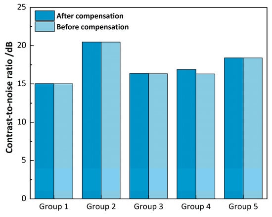 In addition, the CNR results obtained by the system at different blood flow rates were statistically analyzed, as shown in Figure 18. It can be seen that through multiple groups of experiments, the CNR of power Doppler flow imaging based on mechanical scanning is greater than 15 dB, which can effectively extract the signal distribution of the blood flow region. At the same time, it can also be found that motion compensation has less influence on CNR and it is almost the same at different speeds.