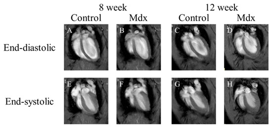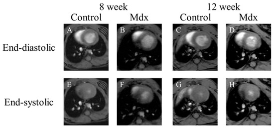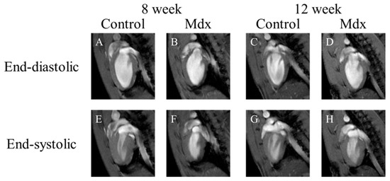 - Stuckey, D.J.; Carr, C.A.; Camelliti, P.; Tyler, D.J.; Davies, K.E.; Clarke, K. In vivo MRI characterization of progressive cardiac dysfunction in the mdx mouse model of muscular dystrophy. PLoS ONE 2012, 7, e28569. [Google Scholar] [CrossRef] [PubMed]