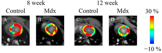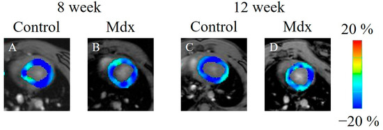 - Li, W.; Liu, W.; Zhong, J.; Yu, X. Early manifestation of alteration in cardiac function in dystrophin deficient mdx mouse using 3D CMR tagging. J. Cardiovasc. Magn. Reson. 2009, 11, 40. [Google Scholar] [CrossRef] [PubMed]