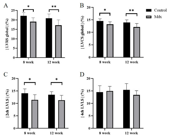 3.4. Strain Analysis by Feature-Tracking Method in 8- and 12-Week-Old Mdx Mice vs. Age-Matched Controls