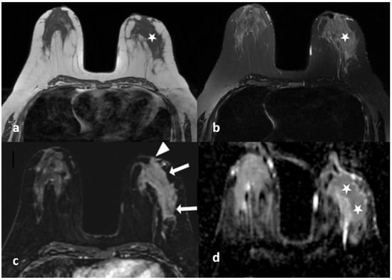 A 40-year-old woman with histopathologically proven idiopathic granulomatous mastitis involving the left breast. (a) T1-weighted fast spin echo axial MR image of the patient shows mild parenchymal asymmetry in the upper outer quadrant of the left breast (star). (b) Axial fat-saturated T2-wieghted fast spin echo MR image, corresponding to (a), which reveals a moderate signal increase in the parencyma (star). (c) Axial contrast-enhanced subtracted image demonstrates a heterogeneous enhancement in the parenchyma (arrows) and a pathologic enhancement extending to the skin in the periareolar region (arrowhead). (d) ADC map at the same location shows a moderate signal decrease (stars) revealing restriction of diffusion in the area corresponding to (a–c).