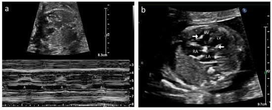 Case B: (a) M-mode echocardiogram showing atrioventricular dissociation in the fetus. A—atrial contractions; V—ventricular contractions. (b) Echocardiogram, four-chamber view—hyperechoic papillary muscle (white arrow in RV and LV).