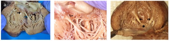 (a) Case A—postmortem gross morphology: mitral valve with ruptured chordae of the anterior leaflet of the mitral valve resulting in shrunken leaflets (black arrow). Calcified chordae (blue arrow). (b) Case A—postmortem gross morphology: mitral valve with retraction and loss of leaflet tissue (black arrow). Calcified/fibrotic chordae (brown arrow). (c) Case B—postmortem gross morphology: left ventricle showing normal mitral valve leaflets (*). Fibrotic/calcified chordae and papillary muscle tips (black arrows).