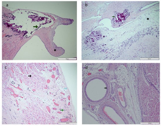 Case A: (a) Hematoxylin and eosin-stained section (original magnification 4×) of the left ventricular papillary muscle with calcified tip (green arrow). *—ruptured chordae showing fibrosis. (b) Hematoxylin and eosin-stained section (original magnification 10×) of the atrioventricular node area with calcification (green arrow) and fibrosis (*). (c) Hematoxylin and eosin-stained section (original magnification 20×) of the myocardium (black arrow) and pericardium (light blue arrow) showing extensive subpericardial calcification (green arrow) extending to the myocardium. (d) Hematoxylin and eosin-stained section (original magnification 10×) of the coronary artery (black arrow), which showed no inflammation.