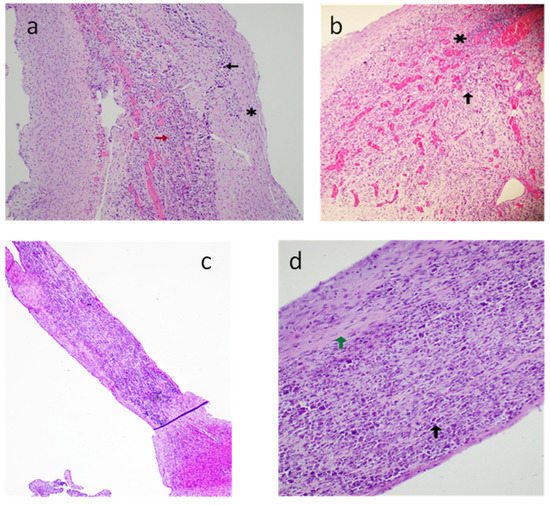 Case B: (a) Hematoxylin and eosin-stained section of the atrioventricular node (original magnification 10×)—calcification (black arrow), fibrosis (*), granulation tissue with neovascularization (red arrow). (b) Hematoxylin and eosin-stained section (original magnification 10×) of the atrioventricular node—acute inflammatory changes with granulation tissue (*), multinucleated giant cell (black arrow). (c) Hematoxylin and eosin-stained section (original magnification 4×) of the right ventricular papillary muscle with chordae. (d) Hematoxylin and eosin-stained section (original magnification 10×) of the right ventricular papillary muscle with chordae, fibrosis (green arrow), and calcification (black arrow).