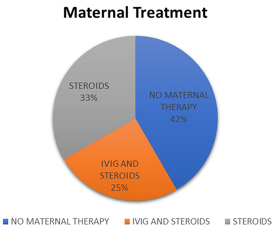 Pie chart showing mothers who received no antenatal therapy (n = 5), steroids only (n = 4), and intravenous immunoglobulin (IVIG) and steroids (n = 3).