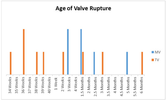 Antenatal valve rupture was noted in three patients, of whom two patients had an isolated TV rupture [8,14]. The third patient had a TV rupture antenatally and a MV rupture postnatally [9]. Two patients were noted to have had a TV rupture immediately post-delivery [12,16]. All MV ruptures were postnatal and occurred from 3 weeks to 5 months of age (Figure 12).