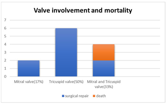 Bar chart showing valve involvement (blue) and mortality (orange). X-axis represents the valve involved. Y-axis shows the number of patients.