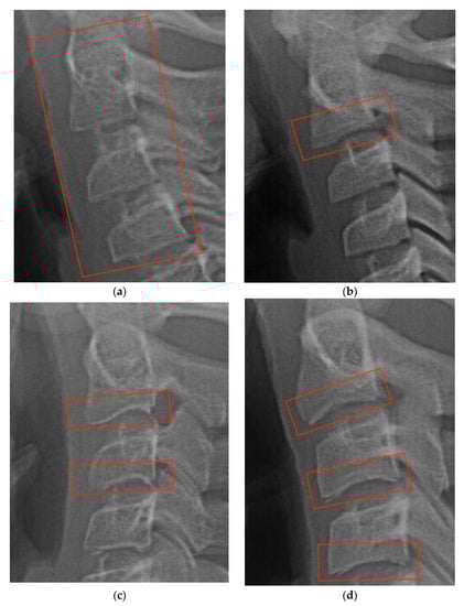 (a) The first stage. The inferior borders of the second, third, and fourth cervical vertebrae are flat and without indent; (b) the second stage. An indentation appeared on the inferior border of the second cervical vertebral, while the third and fourth ones are flat; (c) the third stage. A notch appears on the inferior border of the second and third cervical vertebrae; (d) the fourth stage. All three cervical bodies are indented.