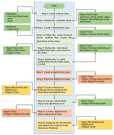 Step 12 involves integrating the blockchain and digital twin objects in the metaverse platform, which is the ultimate goal of the process. Integration means making the blockchain and digital twin objects work together seamlessly to enable new applications and use cases. For example, a blockchain could be used to store the ownership of a digital twin, the history of changes made to it, and the results of simulations run on it. A digital twin could be used to collect sensor data from a physical system, generate alerts based on predefined rules, and trigger transactions on the blockchain.