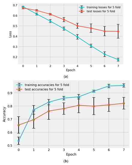 (a) Mean and standard deviation of all five folds’ losses per epoch; (b) mean and standard deviation of all five folds’ accuracies per epoch.