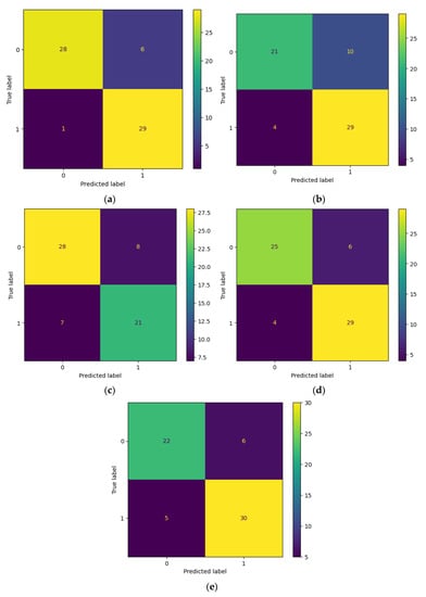The confusion matrix for the validation sets of the (a) first, (b) second, (c) third, (d) fourth, and (e) fifth folds show that the number of false positives is greater than false negatives in all cases. Despite this, the consistency of false and true values suggests that the model is effectively identifying indicators for the sixth stage. It can be concluded that, with more data points, the number of false positives could be reduced significantly given that the only variable between each fold is the training and validation set.