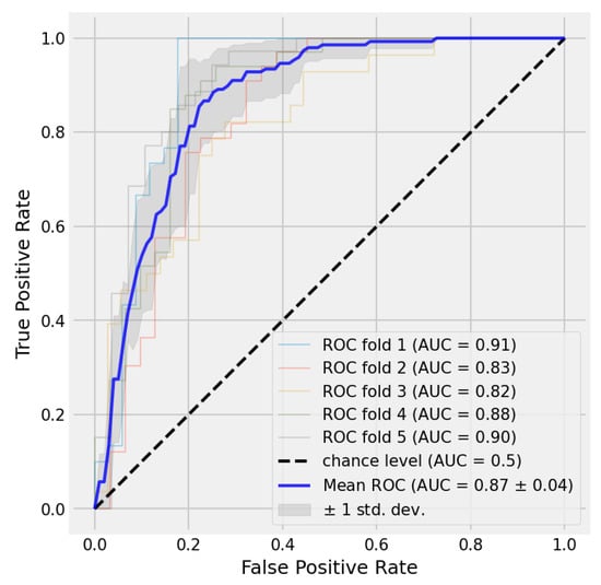 The resulting curve for each fold is depicted in Figure 7. The area under curve (AUC) for mean ROC is . Not only is it a good area but the curve also indicates a reduction in the number of false positives by choosing a threshold larger than 0.5.