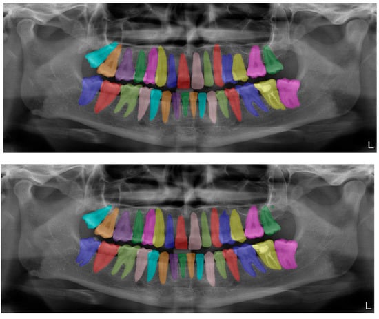 The calculated DSC values across all OPGs (Table 1) were 0.85 for the teeth, 0.88 for dental caries, 0.87 for dental restorations, 0.93 for crown–bridge restorations, 0.94 for dental implants, 0.78 for root canal fillings, and 0.78 for residual roots. Manual segmentations and successful automatic segmentations of the model are given in Figure 2, Figure 3, Figure 4, Figure 5, Figure 6 and Figure 7, while common erroneous automatic segmentations with the most possible reasons are given in Figure 8, Figure 9, Figure 10, Figure 11 and Figure 12.