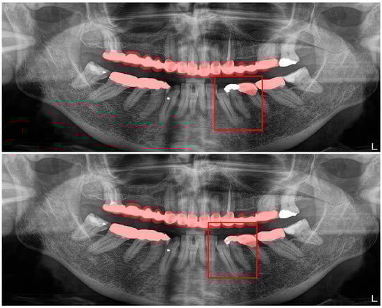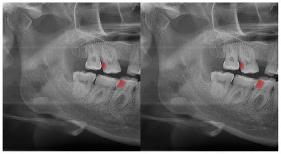 In Figure 10, it can be seen that a wide amalgam restoration in the mandibular left first premolar tooth was mis-segmented as a crown restoration. The mis-segmentation of wide amalgam restorations was seen in a total of five OPGs.