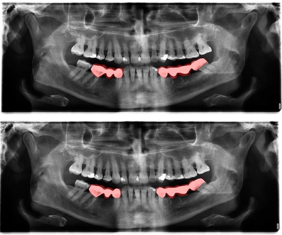 - Leite, A.F.; Van Gerven, A.; Willems, H.; Beznik, T.; Lahoud, P.; Gaêta-Araujo, H.; Vranckx, M.; Jacobs, R. Artificial intelligence-driven novel tool for tooth detection and segmentation on panoramic radiographs. Clin. Oral Investig. 2020, 25, 2257–2267. [Google Scholar] [CrossRef]