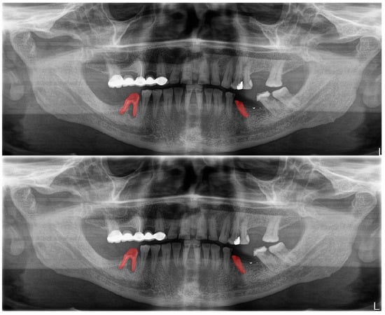 In Figure 8, a more successful automatic segmentation is observed at the maxillary right third molar than the maxillary left third molar, and a missing segmented area in the form of a notch is observed. As most of the upper third molars were superimposed on the floor of the maxillary sinus and zygomatic process of the maxilla, erroneous segmentations were inevitable. In Figure 9, an erroneous automatic segmentation at the mandibular left second molar due to the superimposition between the mandibular left first and mandibular left second premolars can be seen.