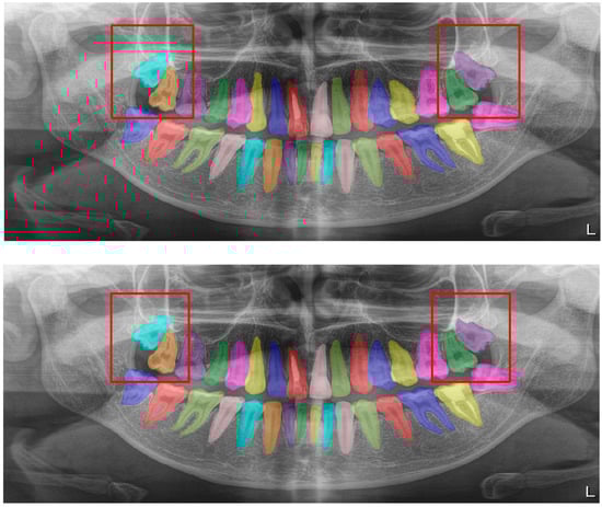 In tooth segmentation, it has been observed that the segmentation of the root apices of the maxillary third molars, especially those that are impacted in a vertical position, in cases where the root apices are superimposed with the maxillary sinus floor, is incorrectly automatically segmented at different degrees. This is one of the reasons for erroneous segmentation, which reduced the Dice score in our study, albeit only by a small amount. The superposition, which we have seen especially in the premolar region on OPGs, actually shows a limitation of OPGs, not a deficiency of our model (Figure 9). The primary reason why our model could not achieve a perfect result in tooth segmentation is because it is almost impossible to avoid superimpositions on OPGs, especially in premolar teeth, and also because patients with crowding are included in the study. Several studies excluded patients with orthodontic problems; however, one of our main goals was to evaluate the success of our model in the general population, since there will not be any exclusions in dental clinics [91,92].