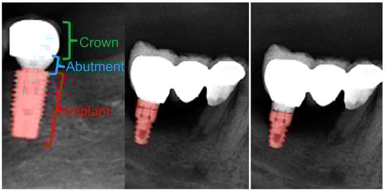 In a systematic review conducted by Revilla-Leon et al., it was reported that the automatic segmentation of dental implants by AI models was between 93.8% and 98% in the literature [93]. Similar to the literature, our model was successful, with a DSC value of 0.94. Due to both their external structures with grooves and metallic opacities, dental implants were not mis-segmented as any anatomical structures or restorations, and the automatic segmentation had an almost perfect DSC. When the reasons for the relatively lower DSC in implant segmentation were examined, it was seen that our model randomly segmented the implant abutment in some OPGs and not in others; therefore, it is fair to state that, in further studies, segmentations of dental implants, abutments, and the crowns on implants via three separate labels might increase the DSC, as mis-segmentation between the abutment and the implant will not be present.