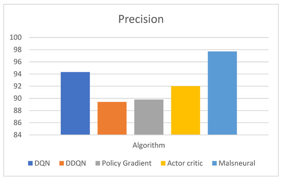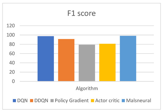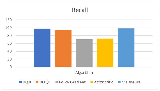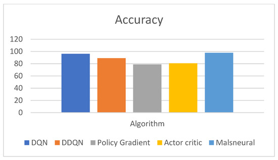 - The comparison of the proposed work with the benchmark mark algorithms, namely, DQN, DDQN, Policy Gradient, and Actor–Critic. Compared with other state-of-the-art methods, the proposed DQN outperforms others with higher accuracy and AUC.