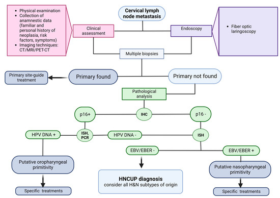 In the clinical management of HNCUP, both HPV and EBV detections are already used to identify the primary tumor of the oropharynx and NPC, respectively (Figure 1). In fact, according to the 8th edition of the TNM Classification of Malignant Tumors from the AJCC/UICC, p16 IHC and EBER-ISH represent essential tests for the diagnosis of the tumor type in HNCUP patients [52].