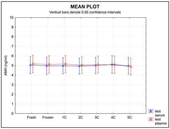 The stability of circulating biomarkers can be affected by repeated freezing and thawing []. The first point addressed in the ISBER stability protocol is the effect of repeated freezing and thawing on the plasma and serum concentrations of a given analyte. In our study, the results show a relatively high stability of AMH during repeated freezing and thawing for all the serum samples. A decrease in the AMH level was demonstrated in the plasma samples after each cycle (Figure 2).