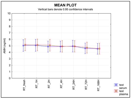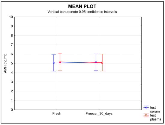 The short-term storage (30 days) of samples at −20 °C resulted in the AMH molecule retaining high stability in both serum and plasma samples (Figure 5).
