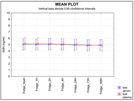 Our study focused on the stability of AMH after blood was separated. However, the stability of AMH in whole blood samples has been described in the literature. Fleming et al. [] reported a significant increase in AMH levels in whole blood samples that were stored in the laboratory (20 h, 44 h, and 90 h) at room temperature (20 °C), as well as a slight increase in AMH levels in whole blood samples stored for 90 h in the fridge (4 °C).