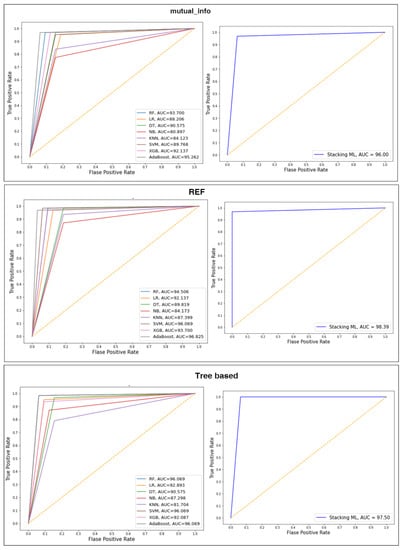 - Proposing stacking ML and comparing it with different ML models using evaluation methods, including accuracy (Acc), precision (P), recall (R), F1 score (F1), and area under the receiver operating characteristic (ROC) (AUC) curve.