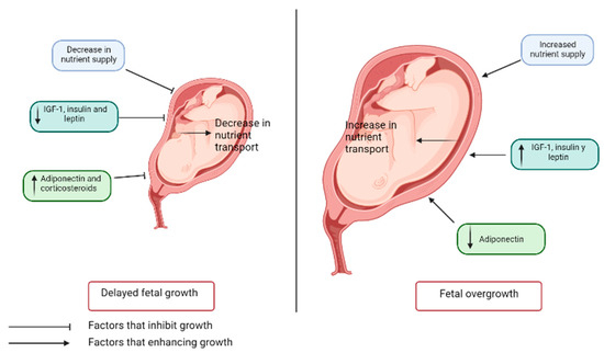 As a result, when the supply of nutrients and the ability to oxygenate the placenta are compromised, placental functions such as nutrient transport and placental growth can be inhibited, resulting in reduced fetal growth. Maternal concentrations of IGF-1, leptin, and insulin are also related to fetal growth, being lower in fetal growth restriction and, conversely, higher in fetal overgrowth, contrary to what happens with adiponectin, which is increased in IUGR and decreased in overgrowth [38]. These adipokines, as explained before, modulate processes such as appetite, and their plasma concentrations are related to the development of diseases such as obesity. On the other hand, under conditions of malnutrition, sensitivity to nutrients may become exaggerated, contributing to fetal overgrowth [39] (Figure 2).