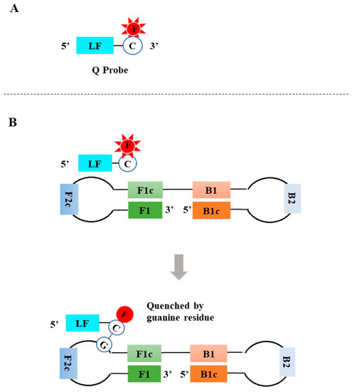 In 2011, Kubota et al. developed the assimilating probe-based LAMP assay [41]. The assimilating probes consist of two partially complementary oligonucleotides: a fluorescence probe and a quenching probe. The fluorescence probe was designed by adding a fluorophore (denoted by F, red)-labeled universal oligonucleotide (F strand) to the 5′-end of the loop primer (LF or LB). The quenching probe (Q strand) complements the F strand of the fluorescence probe and is labeled with a quencher (denoted by Q, blue) at its 3′ end. In the absence of target DNA, the fluorescence is quenched since the hybridization of the fluorescent probe and the quenching probe brings the quencher and the fluorophore together (Figure 3A). In the presence of target DNA, LAMP is initiated. Along the DNA strands initiated by the fluorescent probe, the newly synthesized DNA strand displaces the quenching probe to release the fluorescent signal of the fluorophore (Figure 3B).