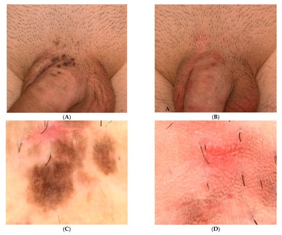 (A) Clinical aspect: multiple, well-defined, flat, pigmented violaceous papules with velvety surface at the root of the penis; (B). Clinical aspects of the lesions at 6 weeks of topical treatment: a significant reduction in the number of the pigmented lesions; a decrease in pigmentation of the residual lesions; erythematous confluent patches at the root of the penis which extend towards the penis and scrotum due to application of Imiquimod 5%. (C). Dermoscopy aspect of the lesions at the beginning of the treatment: pigmented papillomatous surface, brown-grey dots on a brown background, arranged in a linear pattern and widespread dotted vessels. On the upper part of the image, we can see an erythematous area corresponding to the biopsy scar. (D). Dermoscopy aspect of the lesions at 6 weeks of topical treatment: reduction in the number of pigmentary lesions and black-grey dots; distribution of the remaining lesions on an erythematous background caused by the inflammatory reaction to Imiquimod application.