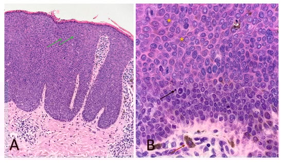 Histological aspects of the lesions of BP (haematoxylin-eosin stain): acanthosis with parakeratosis and lymphocytic infiltrate, with the preservation of the integrity of the basement membrane ((A) ×4); pleomorphic keratinocytes with atypia in the entire thickness of the epidermis (yellow star), with mitoses in the upper epidermis (green arrows), apoptotic cells with small pyknotic nuclei (black arrow) and melanophages (red arrow) ((B) ×40).