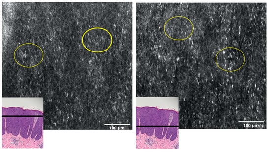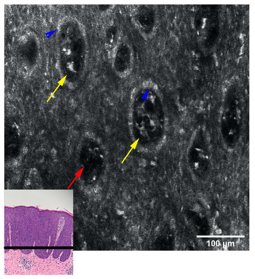 Regarding the RCM aspects, the literature reported the presence of dendritic cells at the level of the spinous and granular layers, dermal papillae surrounded by hyperreflective keratinocytes with cellular atypia, numerous small papillae with a hyperreflective outline and dilated blood vessels at the level of the superficial dermis [17].