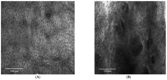 (A) RCM mosaic at the level of the granular layer: uniform honeycomb pattern, with a lower number of inflammatory cells (small bright cells) compared to the previous presentation due to the inflammatory process. (B) RCM mosaic at the level of dermo-epidermal junction: round ill-defined papillae with no large cells with irregular contours and imprecisely defined edges (that correspond to melanophages) as observed in the pre-treatment images.