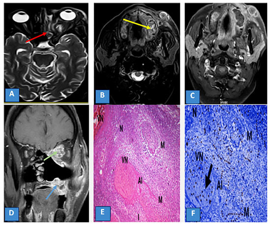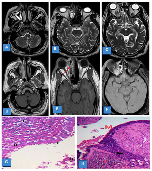 (A,B) Axial T2WI shows partial opacification of the right maxillary and ethmoid sinuses. (C) Axial T2WI shows extension of the inflammatory process to the apex of the right orbit with right eye proptosis. (D,E) Axial T1W postcontrast images show no significant post-contrast enhancement (black turbinate sign) (red arrow). (F) Axial T1W postcontrast fat suppression image shows enhancement of the right orbital apex. (G) Histopathological image of stage I nasal mucormycosis with detached epithelial cells (D) and erosion (E) of the respiratory mucosa (R) with underlying inflammatory cell infiltration, mainly eosinophils (×400, (H,E). (H) Histopathological image of stage I mucormycosis-induced maxillary sinusitis with several fragments of fungal molds (M) in the mucosa, with underlying inflammatory cells forming granulomas of epithelioid cells and lymphocytes (I) (×400, (H,E).