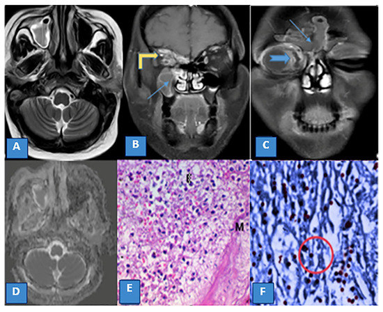 (A) Axial T2WI shows opacification of the right maxillary sinus with an intermediate signal. (B,C) Coronal T1 FAT suppressed postcontrast images show rim enhancement of the right maxillary and both frontal sinuses (thin blue arrows) with an extension of the inflammatory process to the medial wall of the right orbit (thick blue arrow) and around the optic nerve and orbital apex (yellow arrow). (D) ADC map showing restricted diffusion in the center of the right maxillary sinus. (E) Histopathological image of stage II mucormycosis-induced maxillary sinusitis with fungal hyphae (M) destroying the submucosa with extensive inflammatory cell infiltration, mainly eosinophils, admixed with hemorrhage and necrosis (×400, PAS). (F) Immunohistochemistry image of stage II mucormycosis-induced sinusitis with Positive brown cell for Caspases-3 denoting extensive apoptosis (red circle) (AI) (×400, Caspase-3).