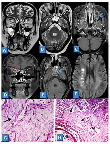 - Safder, S.; Carpenter, J.S.; Roberts, T.D.; Bailey, N. The “Black Turbinate” sign: An early MR imaging finding of nasal mucormycosis. AJNR Am. J. Neuroradiol. 2010, 31, 771–774. [Google Scholar] [CrossRef]