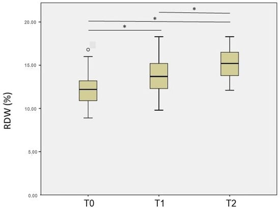 The RDW at T0 (before doxorubicin treatment), T1 (just after the treatment), and T2 (one year after the treatment) in women with breast cancer.* Significant: p < 0.05.