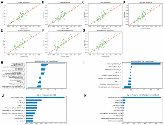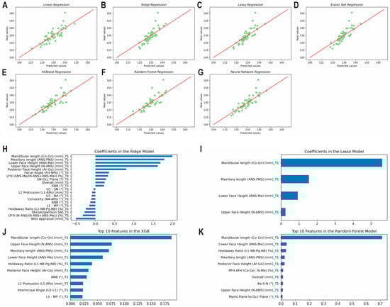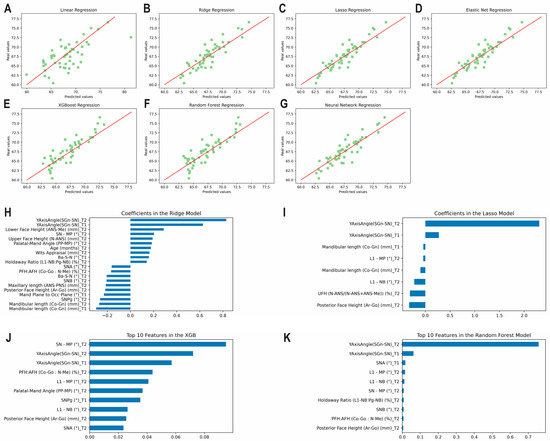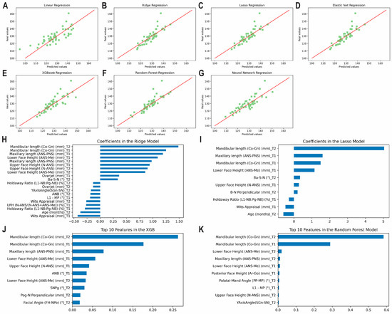 Predicting mandibular length at T3 using predictors from T1 and T2 together. Scatter plots for the predicted and actual values with lines of best fit for the: (A) Least Squares (linear); (B) Ridge; (C) Lasso; (D) Elastic Net; (E) XGBoost; (F) Random Forest; (G) Neural Network models. Top correlating coefficients for the (H) Ridge model; (I) Lasso model; (J) XGBoost model; (K) Random Forest model.