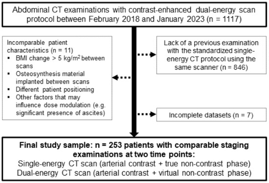 For inclusion in this retrospective single-center study, 1117 patients who underwent an abdominal DECT scan for oncologic imaging purposes on a third-generation dual-source system (SOMATOM Force; Siemens Healthineers; Forchheim, Germany) between February 2018 and January 2023 were eligible. Lack of a previous SECT study on the same scanner led to the exclusion of 846 patients. Furthermore, 11 patients with incomparable examinations (e.g., BMI change > 5 kg/m2 between scans, newly inserted osteosynthetic implants within the scan range, difference in positioning, presence of ascites at one timepoint) and 7 patients with incomplete datasets were excluded from further statistical analyses. The flowchart provided in Figure 1 elucidates inclusion and exclusion criteria, as well as the resulting final population. Permission for this retrospective study was granted by the local institutional review board, which waived the need for additional informed consent (IRB number 20230209 01).