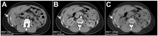 A 42-year-old woman with a history of metastasized breast cancer. A calcified liver lesion (arrows) was visible in the true non-contrast phase of the single-energy baseline CT (SECT; (A)). The dual-energy follow-up CT scan with intravenous contrast enhancement (DECT; (B)) allows for calculation of virtual non-contrast images that can replace the true non-contrast scan in depicting the sclerotic hemangioma in liver segment 6 (C).