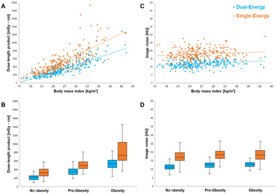 Linear regression analysis and scatter plots revealed the influence of patient BMI on the DLP of DECT (blue) and SECT scans (orange) (A). Note the increasing radiation dose difference between SECT and DECT in obese patients (B). In contrast, the level of image noise in abdominal fat tissue was largely independent of BMI for both DECT (R2 = 0.057) and SECT (R2 = 0.015) (C). Noise in SECT was constantly higher in all three BMI clusters (D).