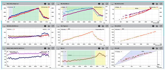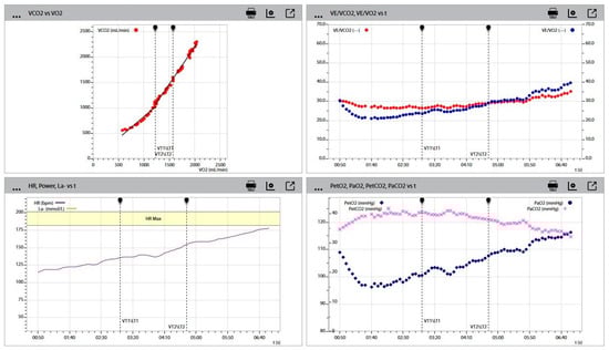 The heart rate was obtained at the first ventilatory anaerobic threshold (VAT) and second ventilatory anaerobic threshold (or respiratory compensation point (RCP)) to determine the intensity of effort at which the transition from aerobic to anaerobic energy sources occurs. VAT and RCP were measured by using the “thresholds” panels of the Wasserman 9-Panel Plot (Panels 4, 7, and 8 in Figure 2 and Figure 4). The V-slope method and VE/VO2 curve kinetics were the methods of choice to obtain VAT. The V-slope method was used to visually determine the first point of departure from linearity of carbon dioxide output plotted against oxygen uptake. A sudden and continuous increase in the ventilatory equivalent for oxygen (VE/VO2) was also a sign of reaching the first threshold. Respiratory exchange ratio (RER), as a quotient of metabolic production of carbon dioxide and the uptake of oxygen (CO2/O2) was used to evaluate the point of RCP, or second ventilatory anaerobic threshold. The onset of absolute anaerobic metabolism was determined by measuring the heart rate at RER = 1. Furthermore, the simultaneous sudden increase in ventilatory equivalents for oxygen and carbon dioxide, as well as the sudden drop in the end-tidal partial pressure for carbon dioxide (PetCO2) indicated reaching the second ventilatory threshold. At this point, ventilatory requirements for delivering oxygen to the muscle cells and the removal of carbon dioxide into the external environment are extremely high. Additionally, the RER value was calculated at the end of the test (maximal value) to assess the metabolic response to the maximal effort and level of achieved anaerobic exertion. Figure 4 shows all the methods described above for determining thresholds.