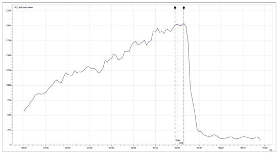 Maximal oxygen consumption (VO2 max), as an objective and accurate indicator of cardiorespiratory fitness and aerobic endurance, was evaluated at the end of the CPET. The plateau in oxygen consumption was considered when determining the final VO2 max value (Figure 3). The oxygen consumption at the first ventilatory anaerobic threshold was obtained to evaluate aerobic economy, which is a measure of energy utilization when running at an aerobic intensity.