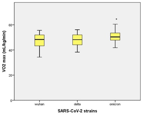 Distribution of VO2 max values within different SARS-CoV-2 strains. * = The mean difference is significant at the 0.05 level.
