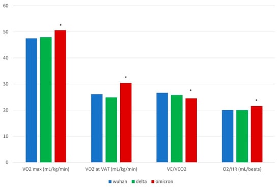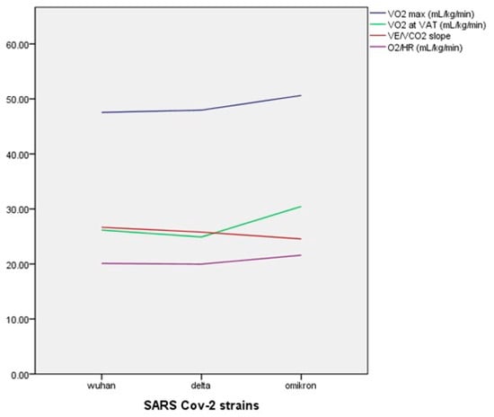 The influence of different SARS-CoV-2 strains on maximal oxygen consumption, aerobic economy, ventilatory efficiency, and oxygen pulse of elite athletes. * = The mean difference is significant at the 0.05 level.